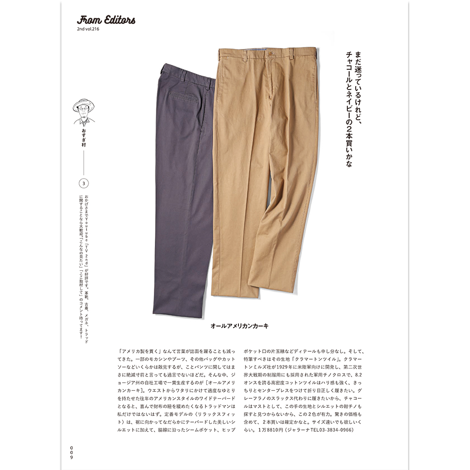 「服と着こなしの細かい話。」という企画にてBIGBILL 183プルオーバーヒッコリーワークシャツ、「FEELIN’ A GOOD BALANCE」という企画にてCarhartt B01 ダブルフロントダックペインターパンツ、Rothco ミリタリーウェブベルト、ALPHA INDUSTRIES MA-1 フライトジャケット、REDKAP PT20インダストリアルワークパンツ、Rothco コットンポリ ツイル BDUパンツが掲載されています。