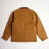 米国カーハートの定番アウターC003。素材は12オンスのヘビーなコットンダックで、襟をコーデュロイで切り替えたクラシカルな作り。台形型の一枚パネルで施されたフロントポケット特徴的。上側はベルクロフラップが付き、下側はかなりの大容量で、デザインだけでなく機能面も◎です。内側はボディから袖先まで、保温性の高いキルティングライナーが張られ、ジップ開閉のポケットも便利。前合わせはネーム入りの2ウェイブラスジップ。ベルクロ式のストームフラップに加え、袖先のニットリブが外気をしっかりシャットアウト。肩口にアクションプリーツ、肘にも小さなプリーツが施され、動き易さを確保してます。メインパネルは全て3本針ステッチで縫い合わせられ、カーハートらしい堅牢な作りも魅力。気負わずデイリーで着られて、汚れたら洗濯機でガシガシ洗える。USワークの魅力が存分に味わえる防寒ウエアです。