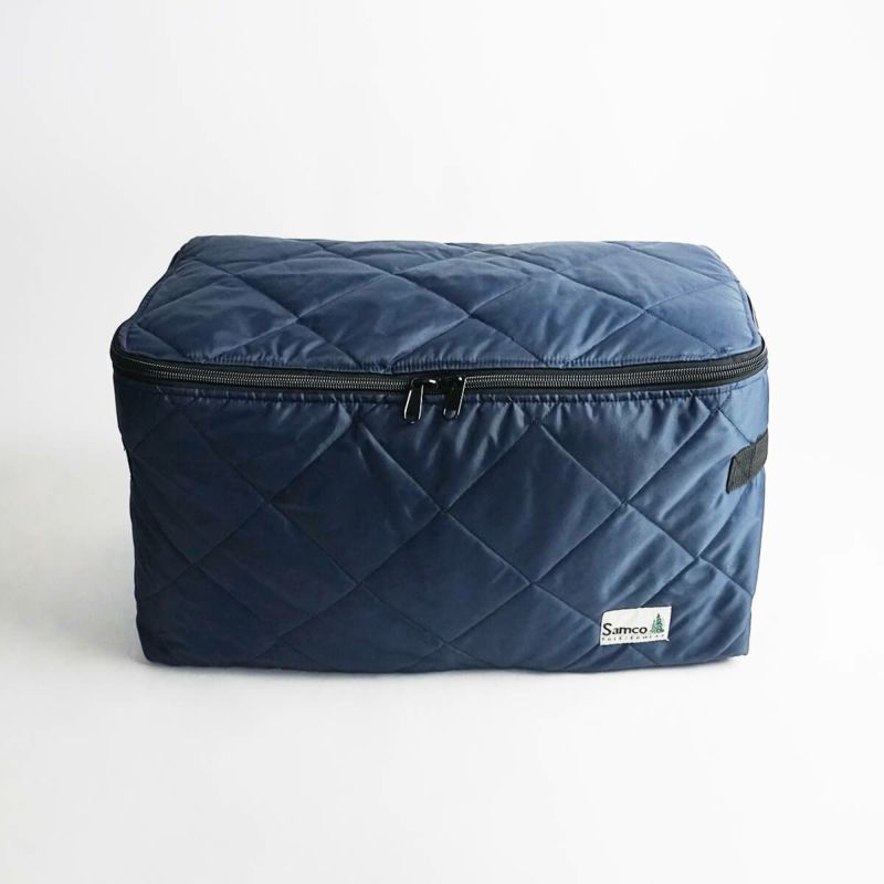 サムコより、キルティングで作られたボックスタイプの保冷バッグTB45。上全面がダブルジップで開閉する出し入れし易い作り。外生地は420デニールのナイロン素材で、軽量かつ耐摩耗性、防水性に優れています。両サイドにつくタフなハンドルは、重量があっても運び易くて便利。使わない時は折り畳んでコンパクトに収納出来るので、車のトランクに忍ばせておけば、買い物やキャンプで大活躍。本来は3ガロンのアイスクリームタブを収納する為のもので、アメリカで実用されている業務用という点に擽られます。ミネソタを象徴する針葉樹モチーフのネームタグも良い雰囲気!