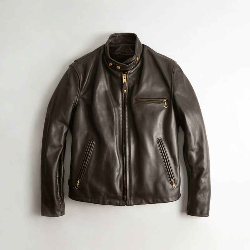 シングルライダースといえば、スタンドカラーのこのタイプ。定番641とは素材が違い、カウハイドレザーを使用。厚みはあるけど、柔らかできめが細いのが特徴です。色目はほぼ黒に近い焦げ茶で、ゴールドカラーのジッパーやスナップが映えます。裏地のパイルベストは取り外し可能。