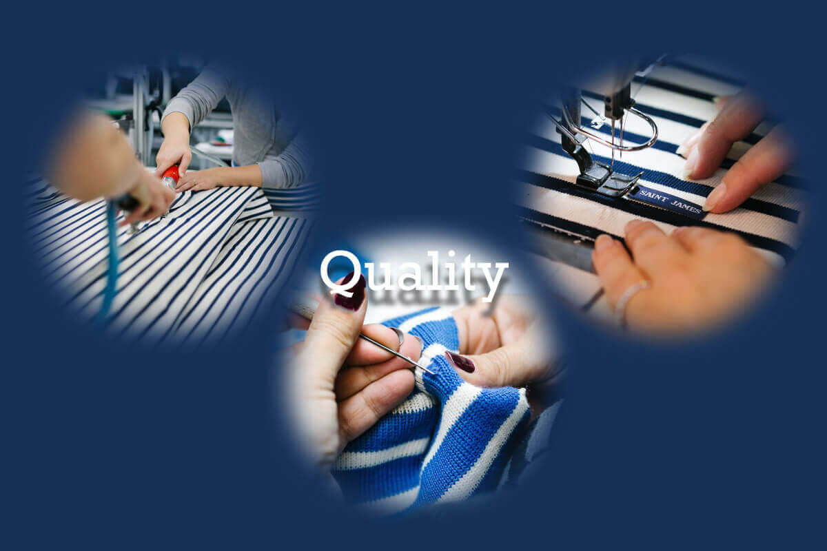 変わらぬスタイルと高い品質がセントジェームスのポリシー。本社工場では、常に一定の高い品質を保つよう、糸の選定・紡績・染色・編み・縫製に至るすべての工程が細部にわたって厳密に管理されています。セントジェームスの代表的なコットンシャツ、OUESSANT(ウェッソン)は創設以来ボートネック、長袖のほぼ原型のモデルを保っており、改良を加える余地がないほど完成度の高い製品です。ノルマンディーの海の暮らしから生まれた実用的なデザインとコットン100%の素材は大変丈夫で、着込んで洗濯を繰り返していくことにより、だんだんと風合いが出て、着る人の身体に気持ちよく馴染んでいきます。