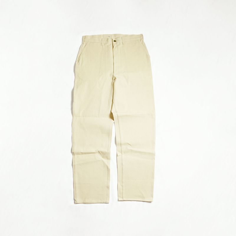 今はなきオシュコシュメンズのペインターパンツ。ヒップ、アウトシーム、インシームと、パネル合わせは全てトリプルステッチ。ジップはタロン42。素材は生成りの綿100%ツイルです。フラッシャーを取れないので画像掲載しておりませんが、右ヒップポケットの織りネームパッチはネイビー地にイエロー文字、ネームの下にUNION MADE SANFORIZEDと入るもので、おそらく80年代のものになるかと思います。ウエスト36のグッドサイズで、フラッシャー付きアメリカ製デッドストック。一本限りとなりますので、お見逃しなく。