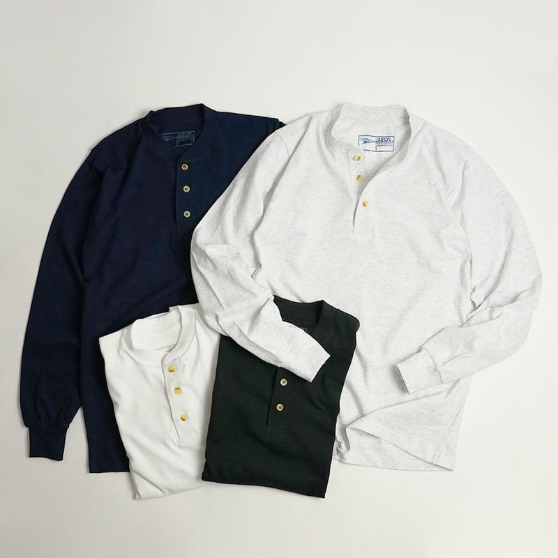 アメリカ製を頑なに貫くシカゴのアパレルメーカー「ユニオンライン」より、タフな長袖ヘンリーネックTをご紹介。素材は肉厚な6.2オンスコットンニット(アッシュのみ混紡)で、袖部分は重厚なリブニットカフ。首回りはリブ仕様で、肩に掛けてテーピング補強が施されています。ヘンリー部分は雰囲気のあるマーブル調の3ボタンで、プラケットやボタンホールかがりもしっかり施されています。米国製の武骨な作りで価格はリーズナブルと、アメカジ好きのツボを得た一枚。品質タグ裏のUFCWロゴ(全米食品商業労働組合)もグッときます。そのままトップはもちろん、インナーとしても使えるので、何枚か揃えておくと重宝します。