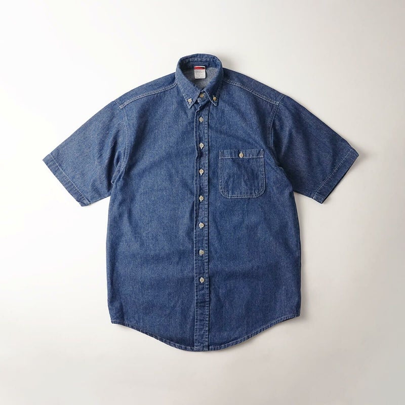 100年以上に渡り米国製を貫く老舗アパレルメーカー、ユニオンラインの半袖デニムシャツ。8オンスのしっかりとしたデニムを使ったカジュアルなボタンダウン。ウォッシュにより各部しっかりアタリが出ており、新品時よりこなれた風合い。ホワイトステッチにマーブルボタンという素朴なディティールが良い雰囲気。胸元のパッチポケットは可愛いラウンドカットですが、微妙にカクカクしてる辺りもアメリカンな仕様。シルエットもアメリカンなので、ザックリ目に羽織って頂くのもおすすめです。