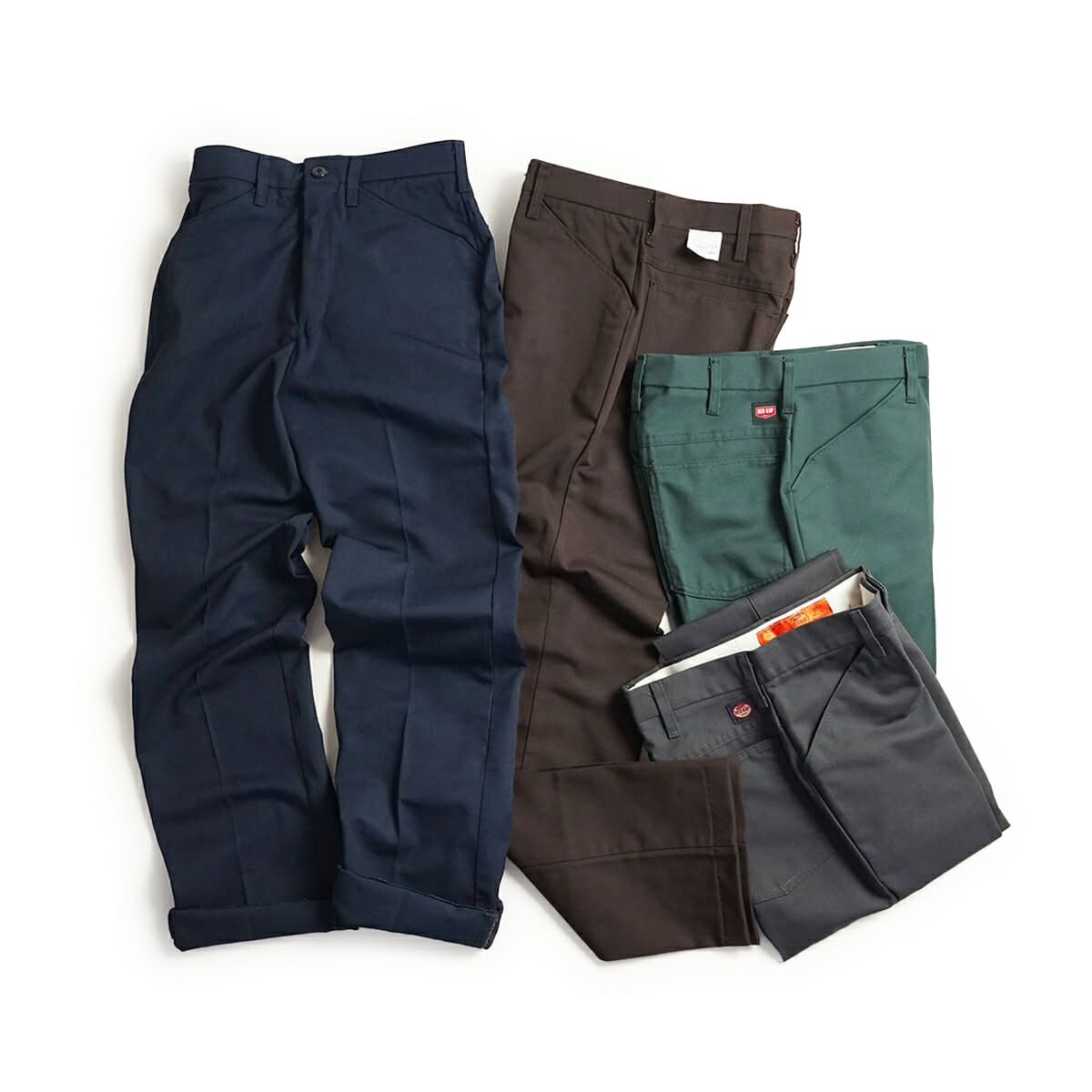 レッドキャップの定番ワークパンツ、ジーンカットPT50。フロントポケットはアクセスし易いL字型で、ヒップポケットはダブルステッチ+バータック補強で縫い付けられた五角形のパッチタイプ。バックヨークが施されており、履き心地もGOOD。文字通りジーンズの様に仕立てられたパンツです。素材は7.5オンスの65/35TCツイルで、汚れにくく、シワにも強い。弱めのパーマネントプリーツ(洗濯しても元に戻る)が、程よくきちっと感を演出してくれます。細身のストレートシルエットで、あらゆるシーンに穿き回せる万能パンツ。デイリーで使えるので、何色か揃えて頂くと、着回しの幅も広がります。