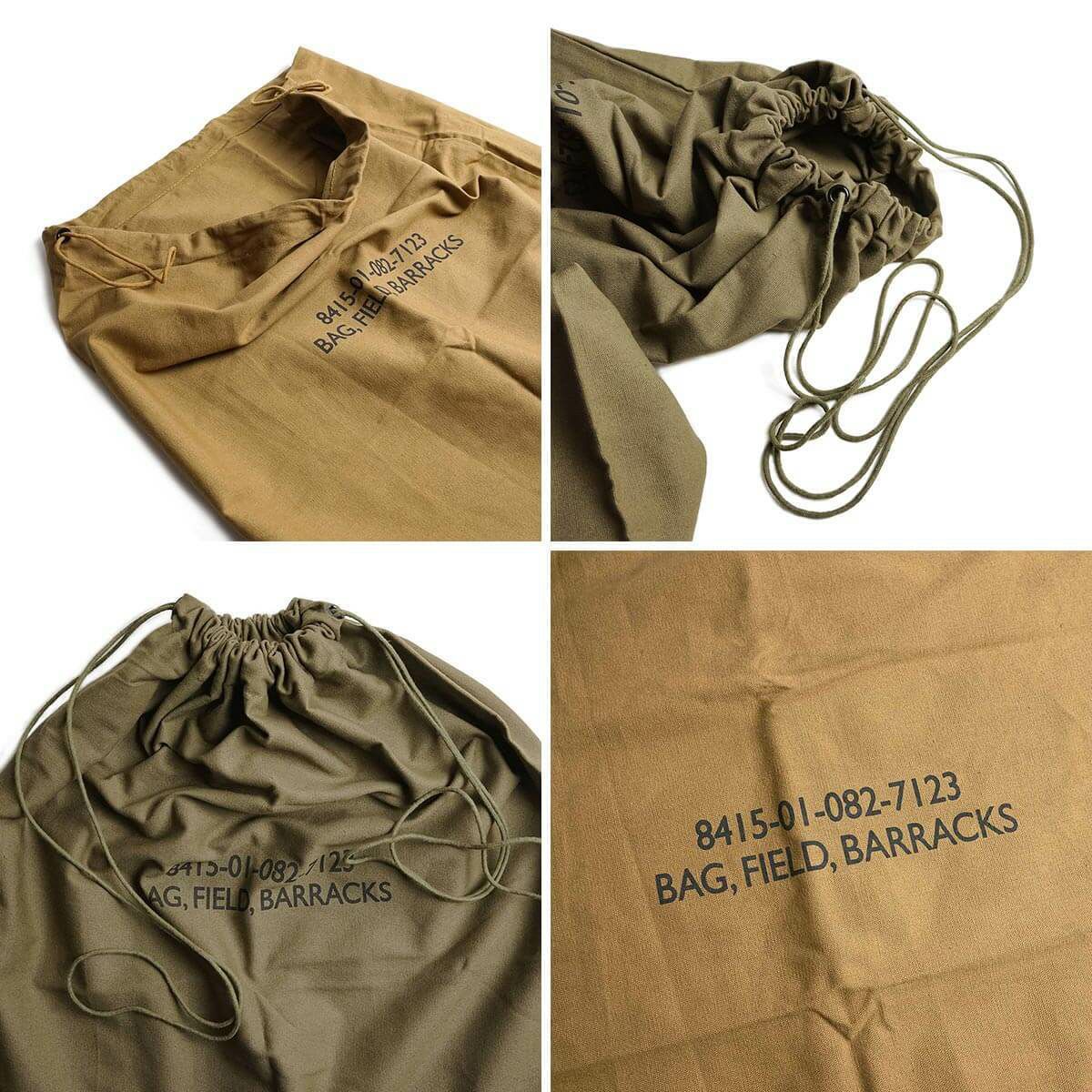ロスコより米軍の兵舎用バッグ「バラックスバッグ」。素材は12オンスのコットンキャンバス。上部の紐を引っ張ると閉じる巾着型で、紐の通り口にはハトメが施されています。カラーはオリーブとコヨーテの二色で、中央に配された文字プリントもミリタリーを感じさせるデザイン。キャンプ、アウトドア、車内、ガレージ等、様々なシーンでの収納袋として大活躍。ミディアム、ラージの2サイズ展開になりますので、用途に合わせてお選び下さい。