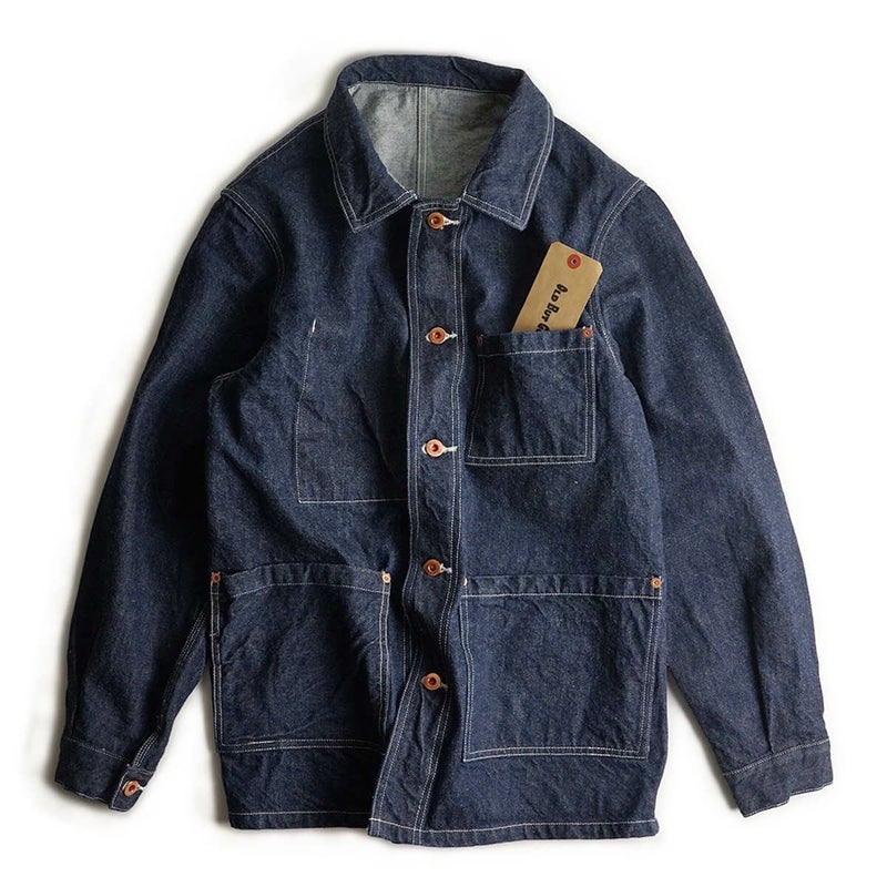 オールドバッドゴールドよりデニムカバーオールをご紹介。フランスの伝統的なワークジャケットをベースにデザインされており、銅製の打ち抜きリベットやドーナッツボタン、三本針のサイドシーム等、付属から生地、縫製まで一貫して日本国内生産に拘った一着。生地には世界的に有名なカイハラ社製の14ozデニムを使用。縦糸緯糸共に6番手の糸を使用し、経糸はピュアインディゴでロープ染色を施しているため、着込むことにより、中白に染まった独特の当たり感が出てきます。整理加工のされていない生機のデニム生地を使うことによって、表面の毛羽感やゴツゴツとした無骨な生地の表面感が、ヴィンテージデニムさながらの表情を演出しています。