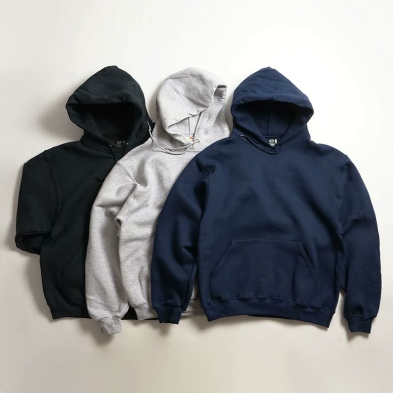 米国流通のフルーツオブザルームより、スーパーコットンと呼ばれるスウェットシリーズをご紹介。昔ながらのボックスシルエットで、アームもゆとりある作り。12オンスの肉厚なスウェット生地は、耐久性が高く、裏側起毛で肌触りも抜群。リブやパネルの取り付けは、二本針のカバーステッチでしっかり縫製。かなりタフなアイテムながら、驚く程リーズナブルな価格設定は嬉しい限り。まさにデイリーウエアに打って付け。一般流通はしていない希少品番につき、お見逃しない様お願い致します。 こちらはプルオーバーのフードパーカ。フード部分は12オンスの生地が二重になっており、かなりのボリューム。共色の丸紐コードで、通し口はメタル製のハトメが施されています。お腹部分はベーシックなカンガルーポケットになります。