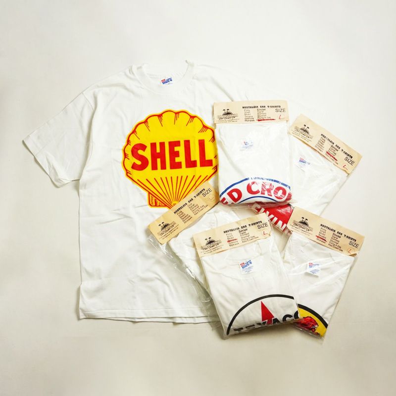 アメリカの古いガススタンドをシリーズにしたプリントT「ノスタルジアガスTシャツ」のデッドストック。シェルやテキサコなど、現存するものもありますが、大半はなくなってしまった会社。ボディはアメリカ製のビーフィー。パッケージデザインも良く、該当商品のチェックとサイズがマーカーで手書きされています。カリフォルニアカーカバーという車のカバーのメーカーが企画した商品の様で、おそらく1980年代のものと思われます。パッケージ付きデッドストックですが、長期在庫につき小さな汚れ等あるものもあります。在庫はそれぞれ一枚ずつとなります。