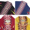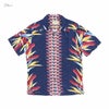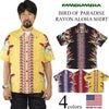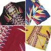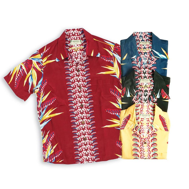 カメハメハの代表作「バードオブパラダイス」。和名を極楽鳥花という、ハワイを代表する植物をモチーフにした人気柄です。カメハメハが得意とするボーダー(縦縞)パターンで、エンジニアードプリントと呼ばれる技法により、しっかりとセンターに配置されています。また、フロント、胸ポケットの柄合わせも見事。素材は微細な畝と光沢が特徴で、初期ヴィンテージアロハにみられる富士絹に似た生地感がその名の由来とされるフジエットレーヨン。トップにループを用いた開襟襟で、サイドシーム、アーム取付はダブルステッチを採用。フロントは風合い豊かなリアルココナッツボタンで、替えボタンもしっかり付属してます。