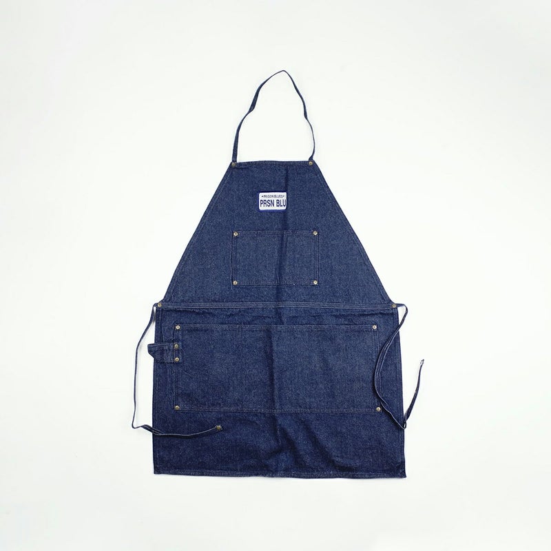 プリズンブルースより、囚人達のハンドメイドで作られたデニムエプロン。胸とお腹に使い勝手の良いパッチポケット。右側にはツールループも付属。ヘビーなデニムを採用し、二本針ステッチで各部しっかり縫製。さらに負荷がかかる部分には重厚なリベットが施されています。トップに配されたプレート調のネームパッチも秀逸。非常にタフな作りで、ガレージ作業からバーベキューまで、味が出るまでガシガシ使い込んであげて下さい。