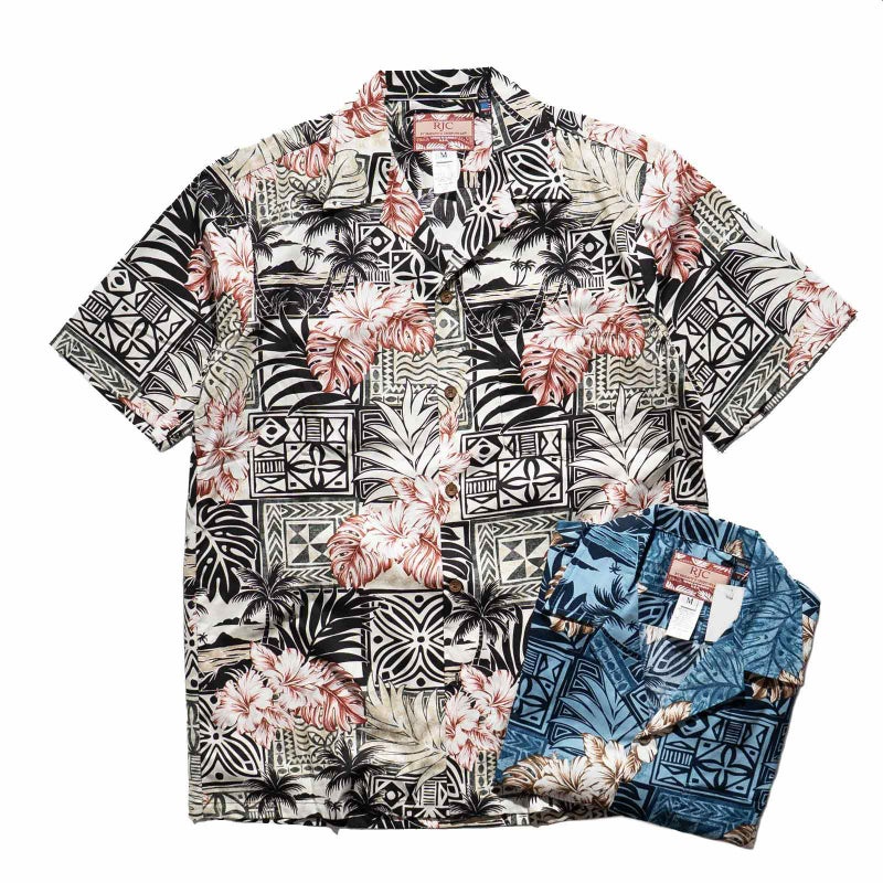 RJCこと、ロバートJクランシーのアロハシャツ。綿100%のライトなポプリン生地は、吸汗性が良く、爽やかな着心地。島を感じさせる鮮やかなテキスタイルも見事です。形は、ボタンフロント、開襟襟のベーシックなタイプ。ピッタリと柄合わせされた胸ポケットを始め、味わい深い刻印入り天然ココナッツボタン、耐久性を考慮した二枚仕立てのバックヨーク、動き易いサイドプリーツなど、この値段では考えられない程しっかり作りこまれています。さらにハワイ企画、ハワイ製と言うのだから驚き。ホントに?と思われる方、まずは一枚お試し下さい。