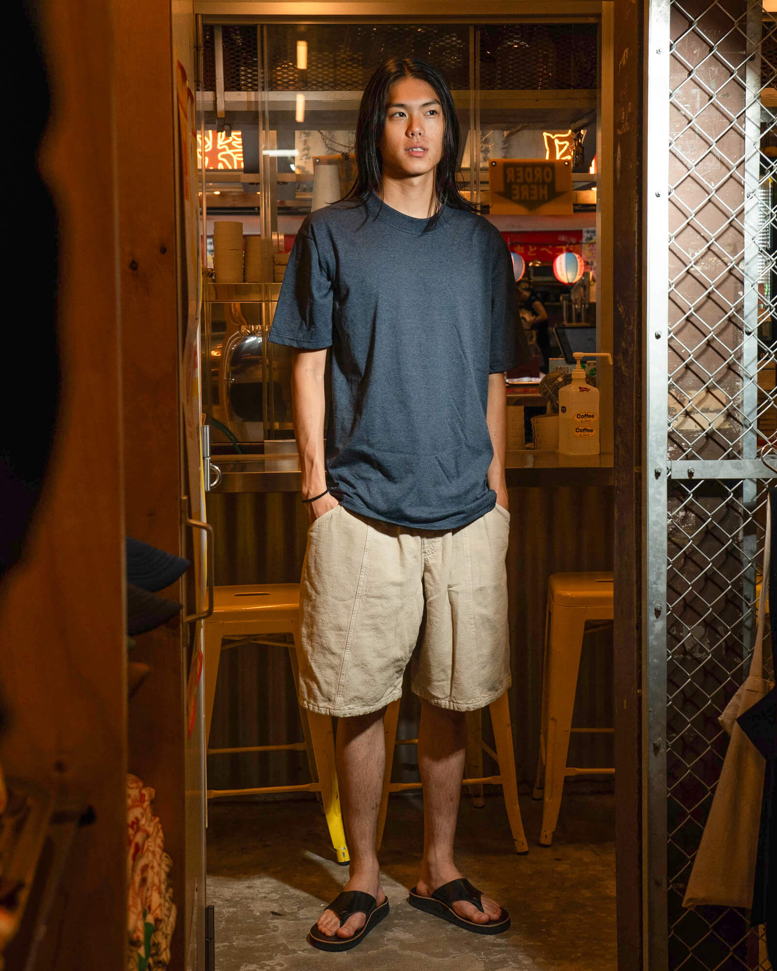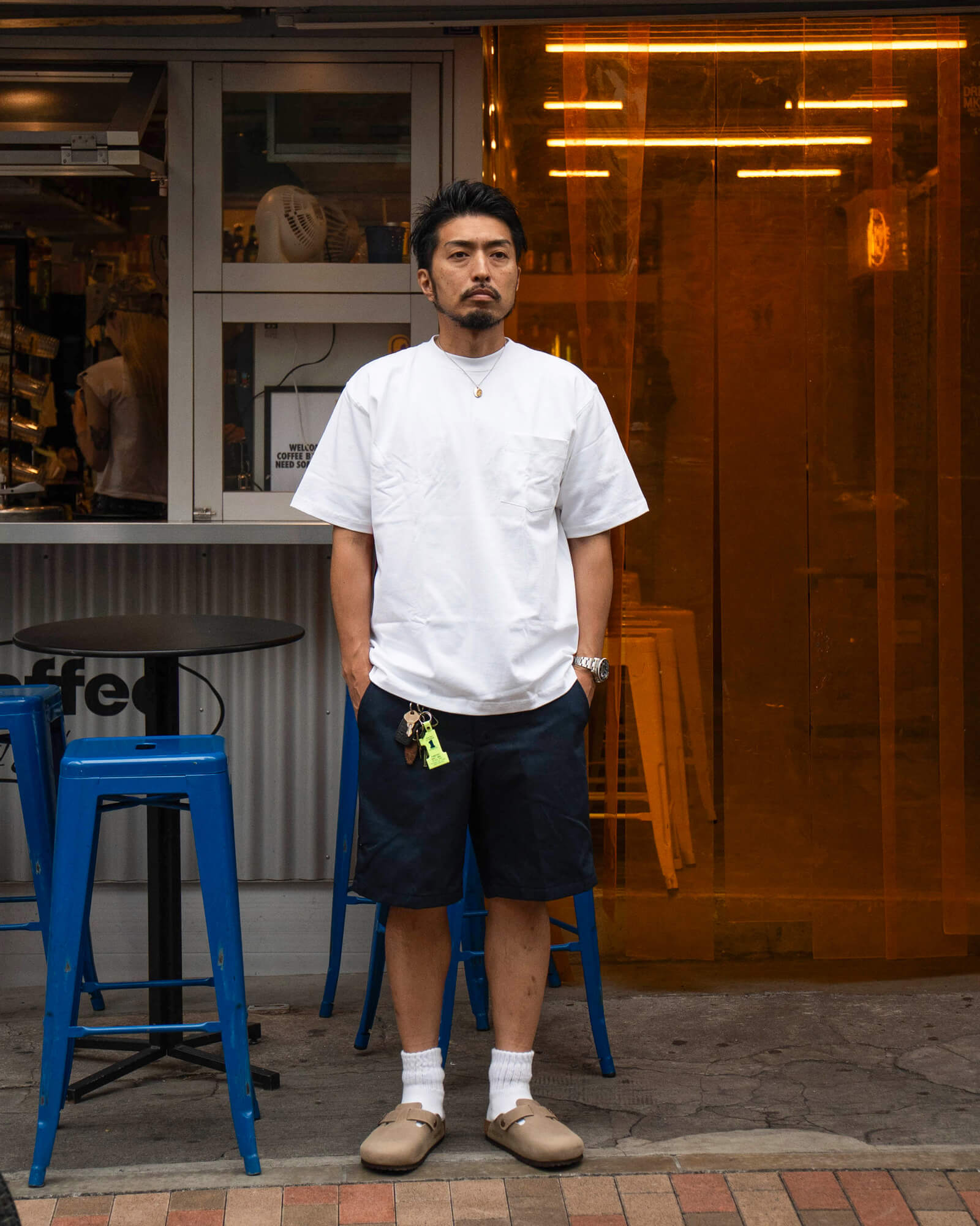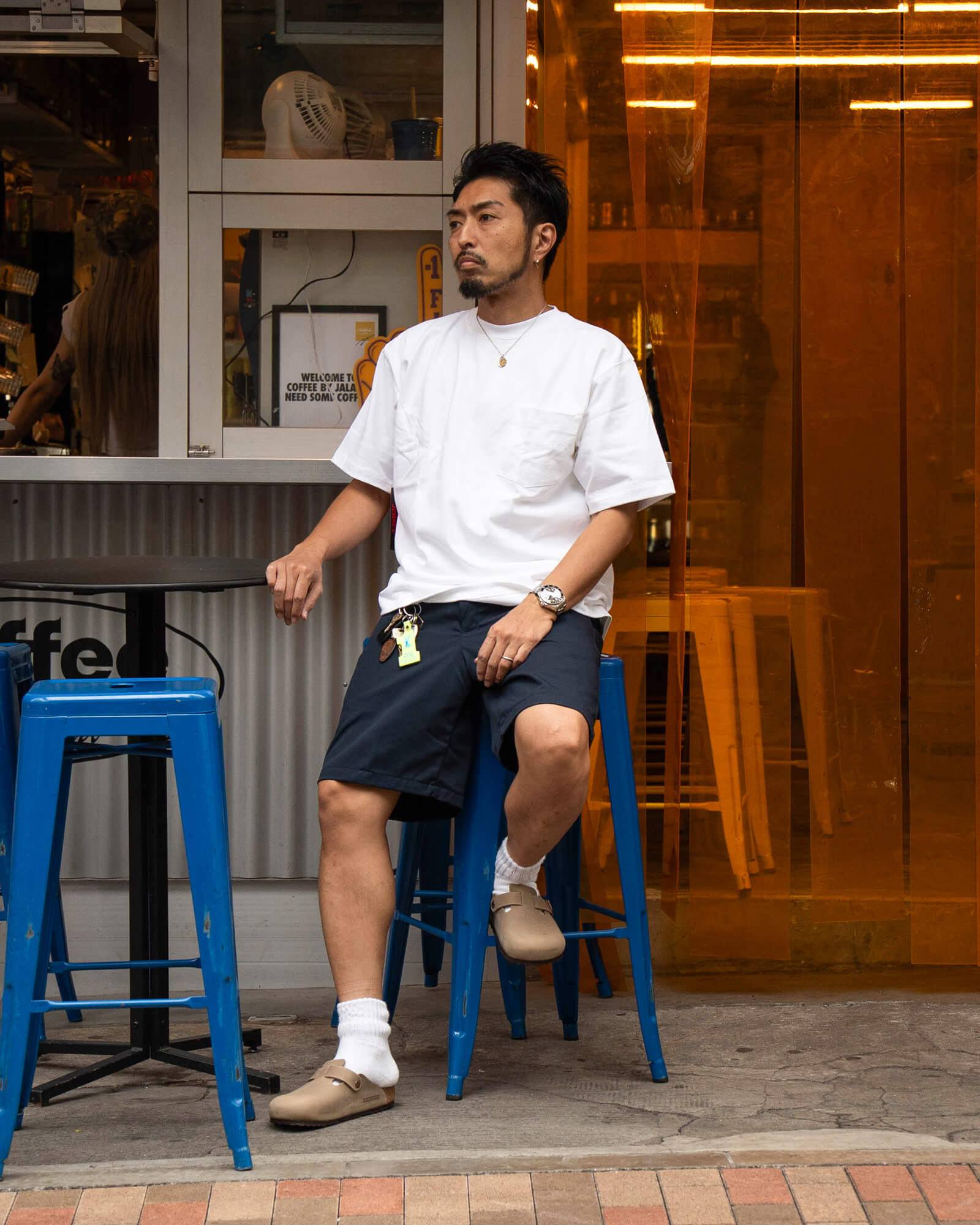 サイズ感やレビュー:ジャストサイズで着用しています。サラっとした肌触りで、暑い夏も快適です。汚れやシワに強いのも嬉しいところ。