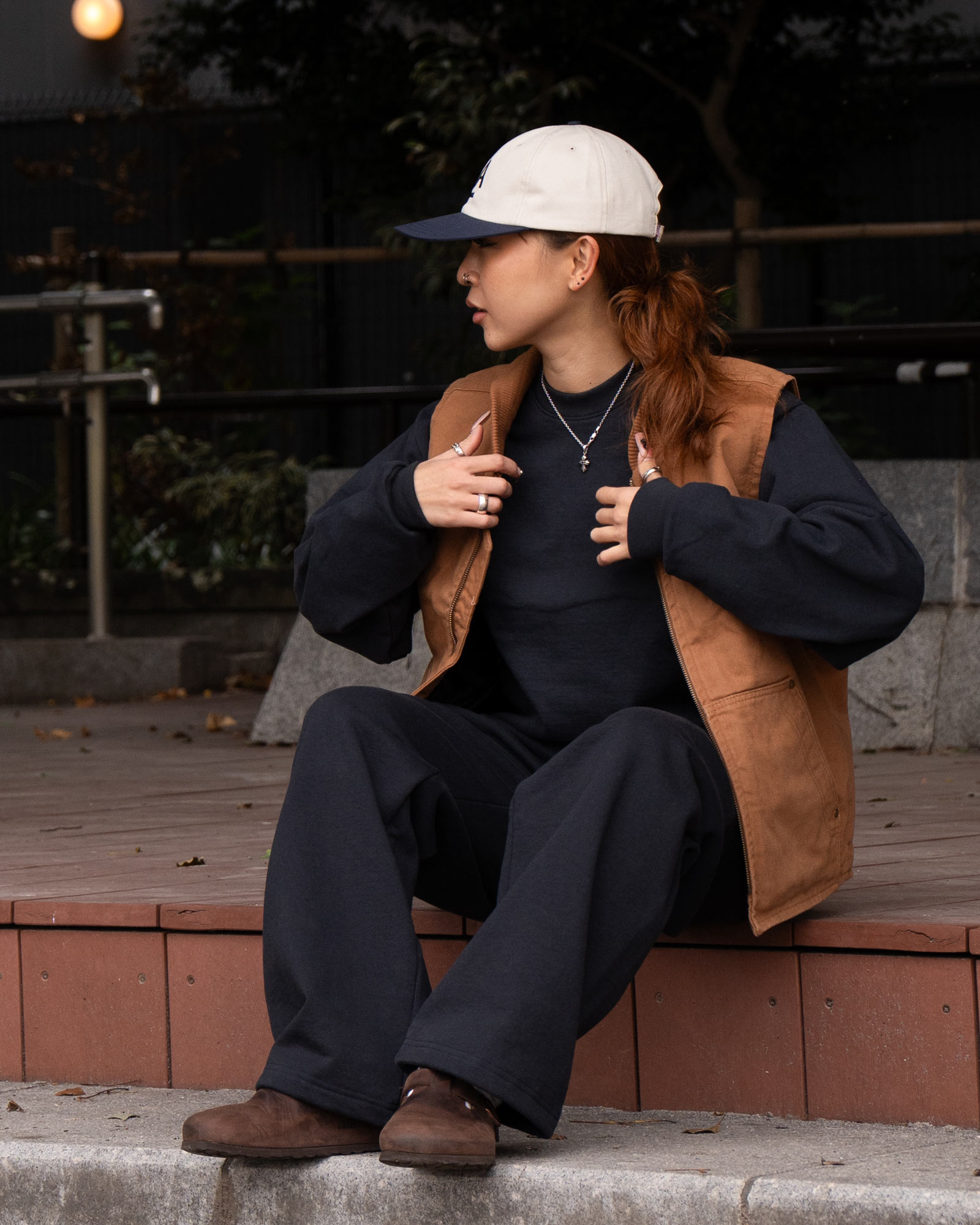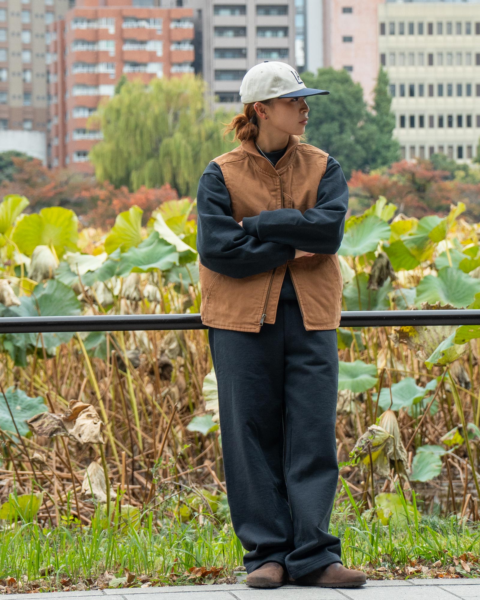 ロサンゼルスアパレルのワイドスウェットパンツを合わせて、力の抜けたアメカジスタイルにしました。