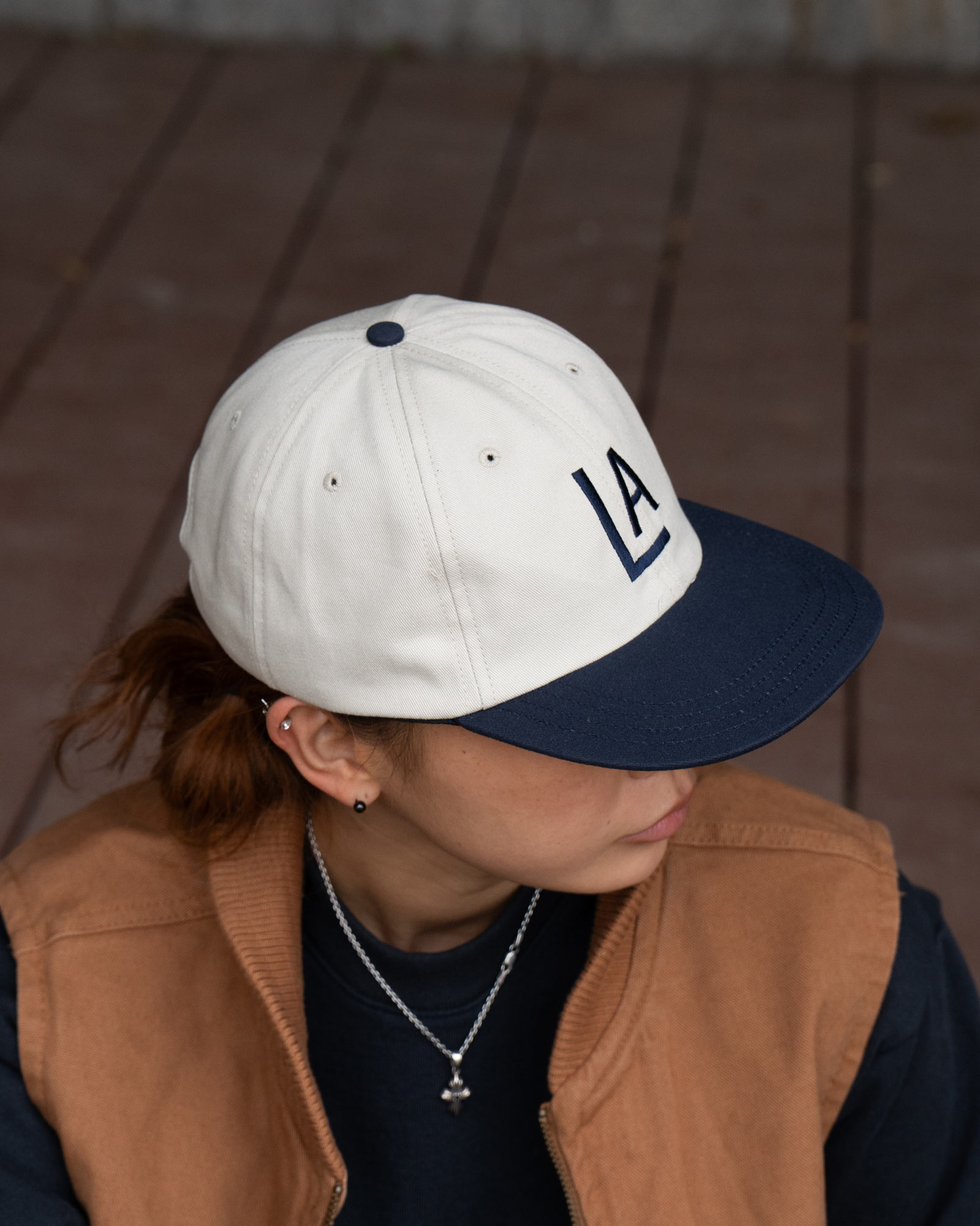 ネイビー×ブラウンの落ち着いた配色に、小物でキャップを合わせてアメカジらしさを出しました。