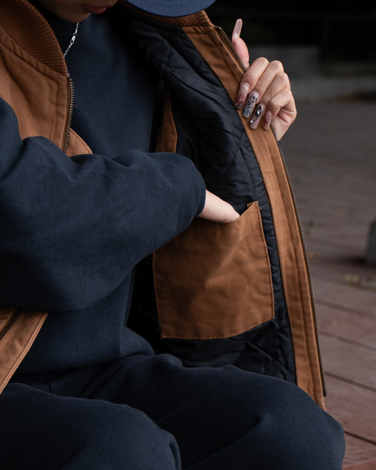 ネイビー×キャメルの組み合わせは落ち着きがあり、春先でも重たく見えません。