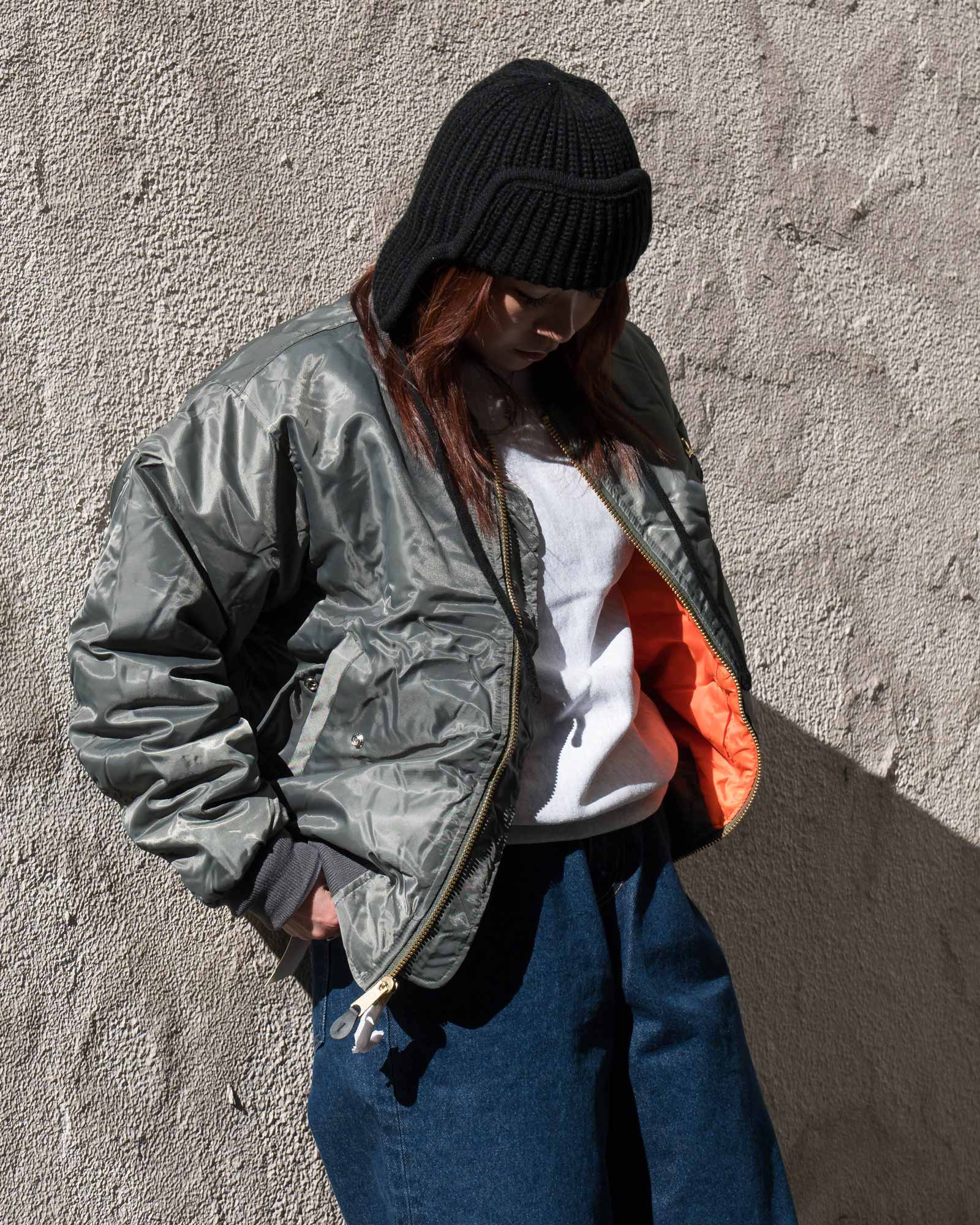 「MADE IN USA」のスーパーバギージーンズに、アメカジの定番であるMA-1とスウェットを合わせ、