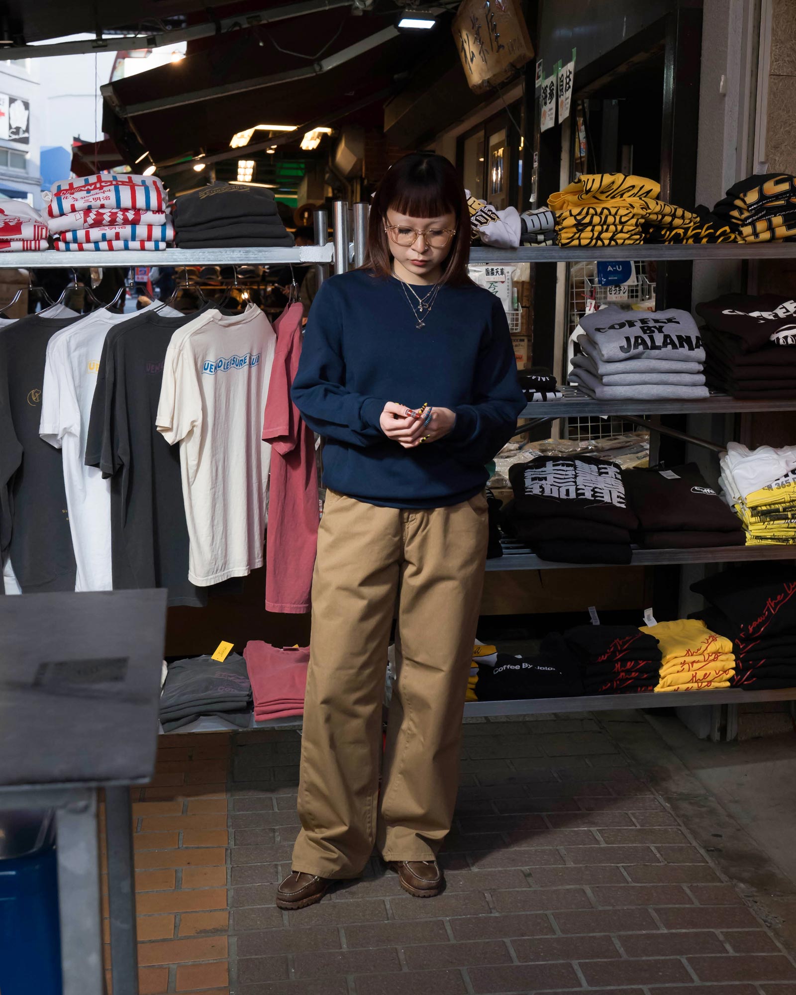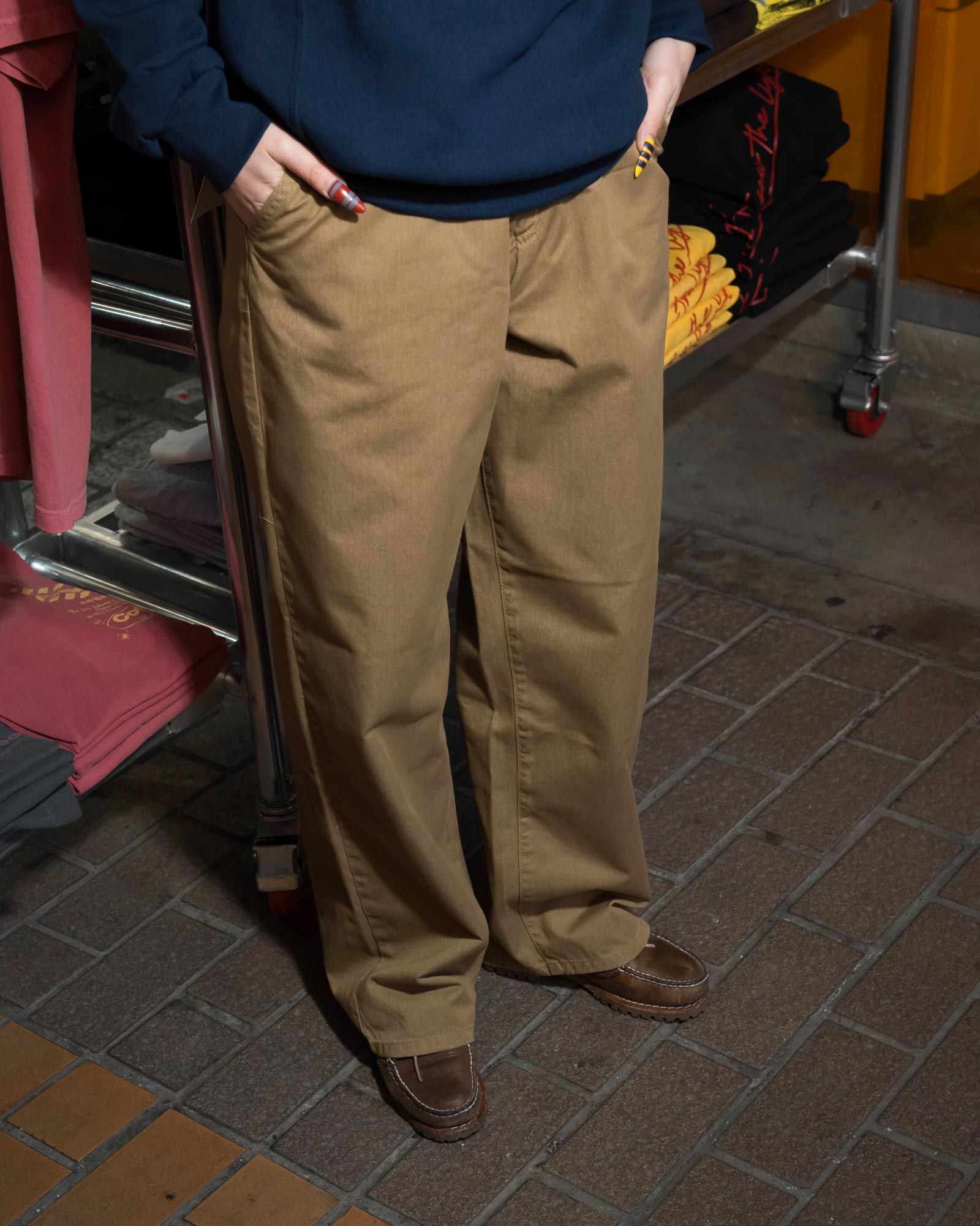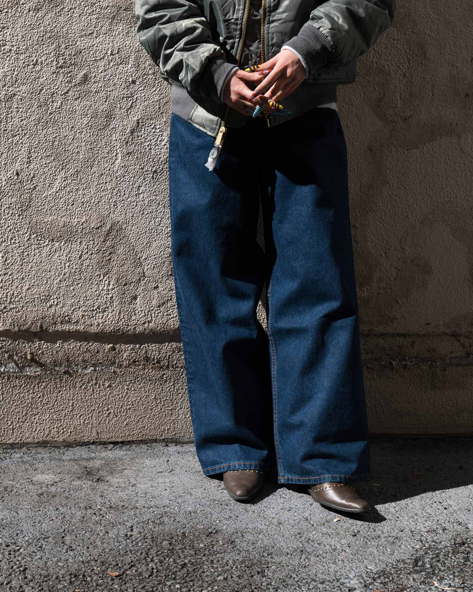 ボトムにはネオブルーのバギーチノを合わせて、トップスはシンプルに、シルエットでアメカジらしさを出しました。