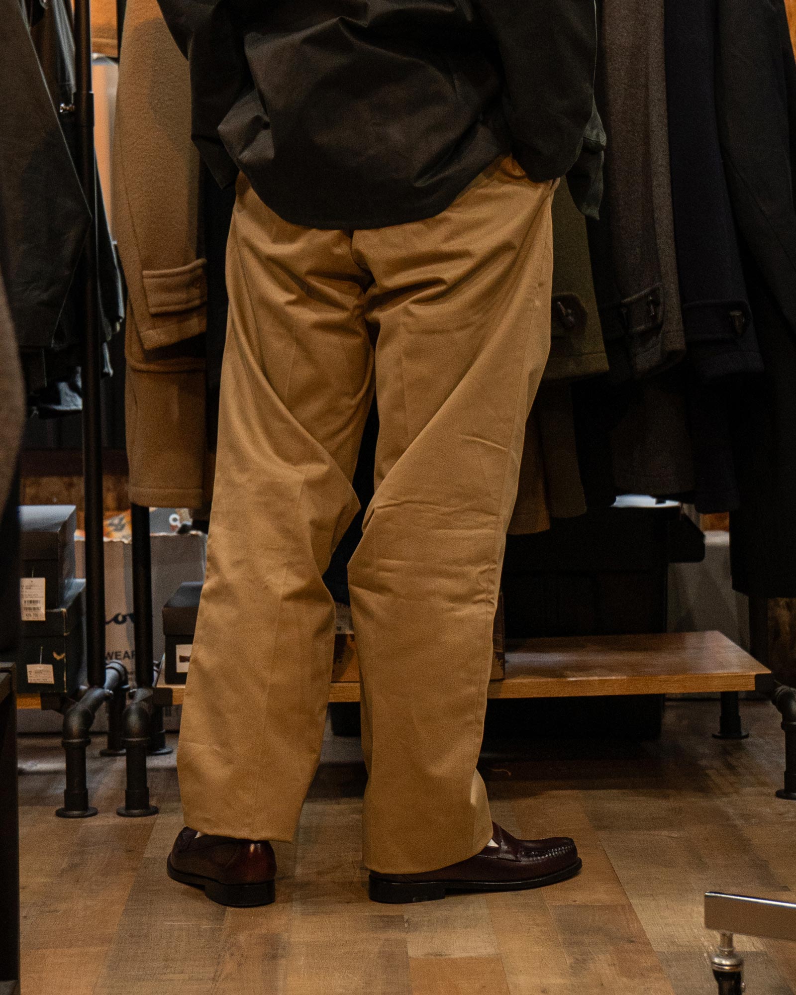 サイズ感やレビュー:ウエストからワタリに程よいゆとりがあり、裾に向かってなだらかにテーパード。太すぎず細すぎないバランスで、流行り廃りに左右されず使いやすいチノパンです。
