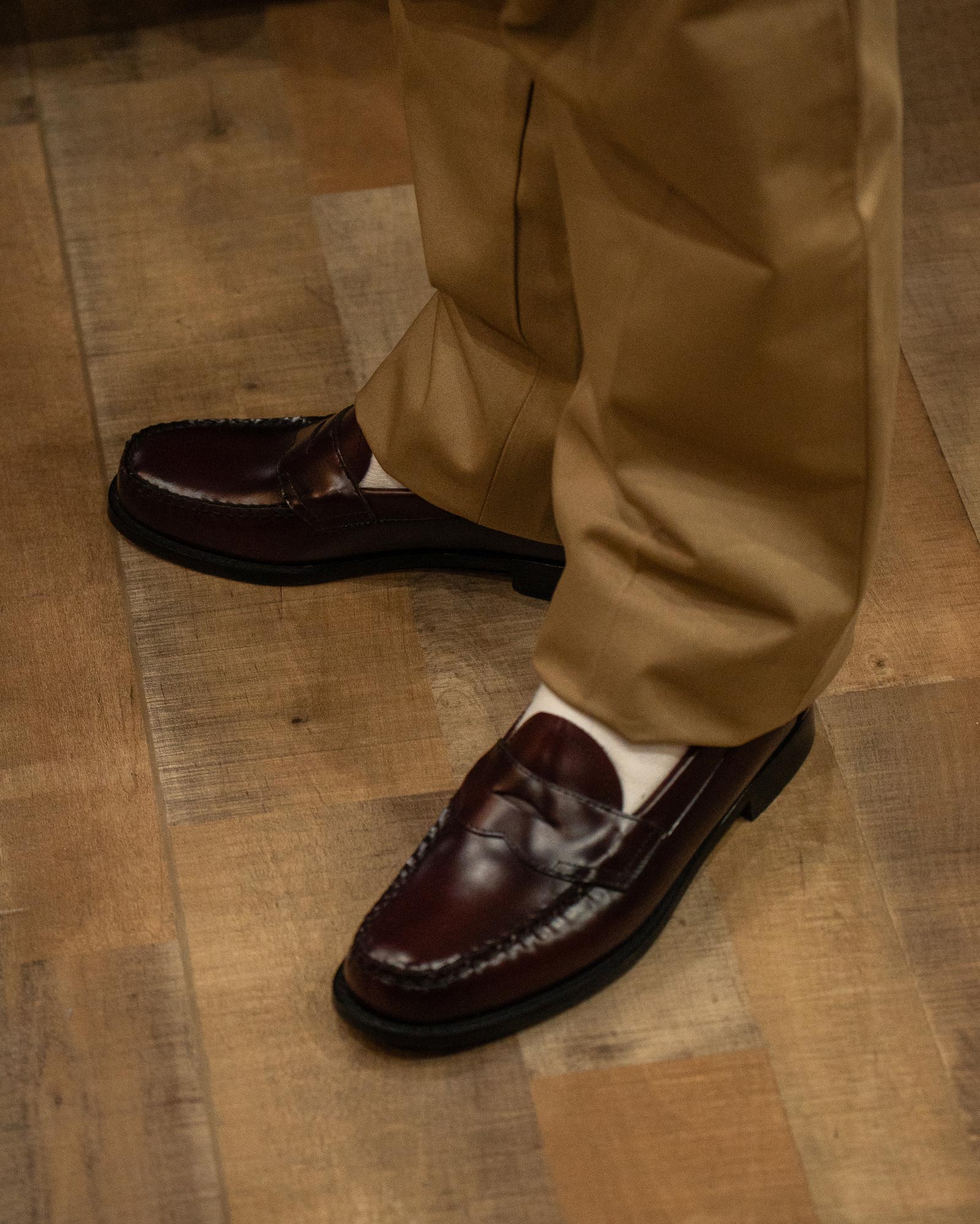 サイズ感やレビュー:BASSの定番ペニーローファー「ローガン」を着用。一点一点手縫いで仕上げたモック構造のスリッポンで、軽快で快適な履き心地です。足元に取り入れるだけで程よく品のある印象にまとまります。