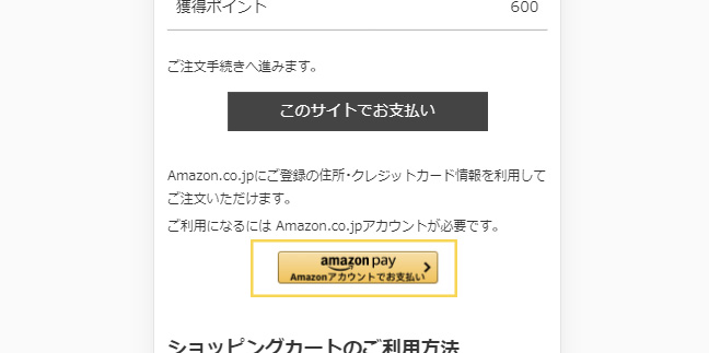 買い物かご内で、Amazon Payの黄色バナーをクリックし、お持ちのアマゾンアカウントでログインして下さい。