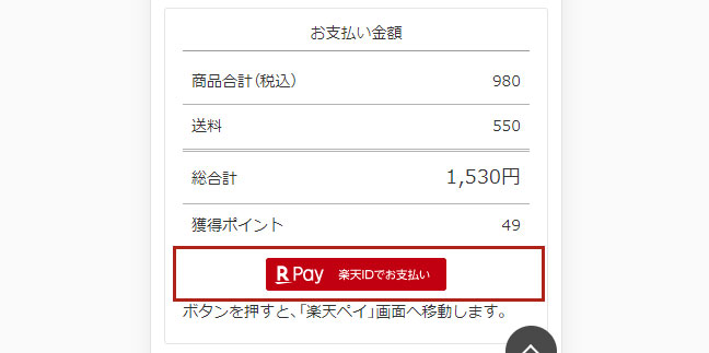 買い物かご内のお支払い方法選択で「楽天ペイ」を選択頂くと、画面最下部(PCは画面右側)に赤いRPAYボタンが出ますので、こちらをクリックして下さい。
