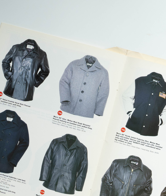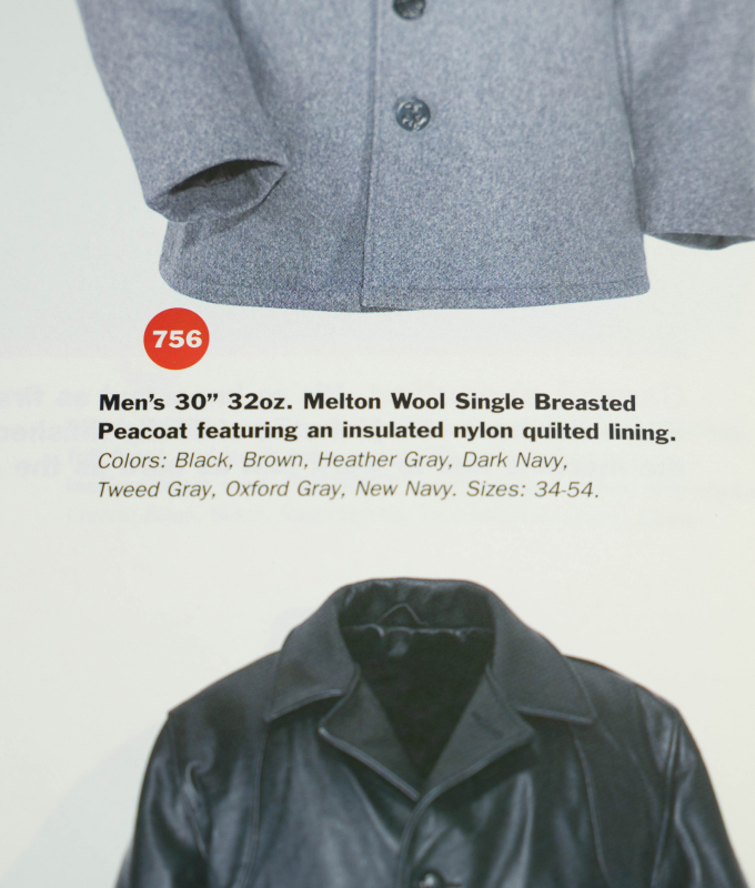 ピーコートと言えば、740に代表されるダブルタイプが定番ですが、このシングル品番756は、弊社が卸売をしていた1990年代に、より幅広く着まわせるモデルとして別注をかけたことで生まれました。1996年からはカタログにも掲載され、Schottの正式品番として数年間ラインナップされていました。