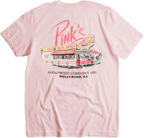 こちらもピンクスのオリジナルTシャツ。お店のロゴとホットドッグがプリントされた、分かりやすいデザインですね。メルローズ本店の看板をそのままTシャツにしたもので、インパクトがあって大好きな1枚です。シンプルにピンクスのロゴが可愛い!色もピンクでポップだし、コーディネートのアクセントにぴったりな1着ですよ!
